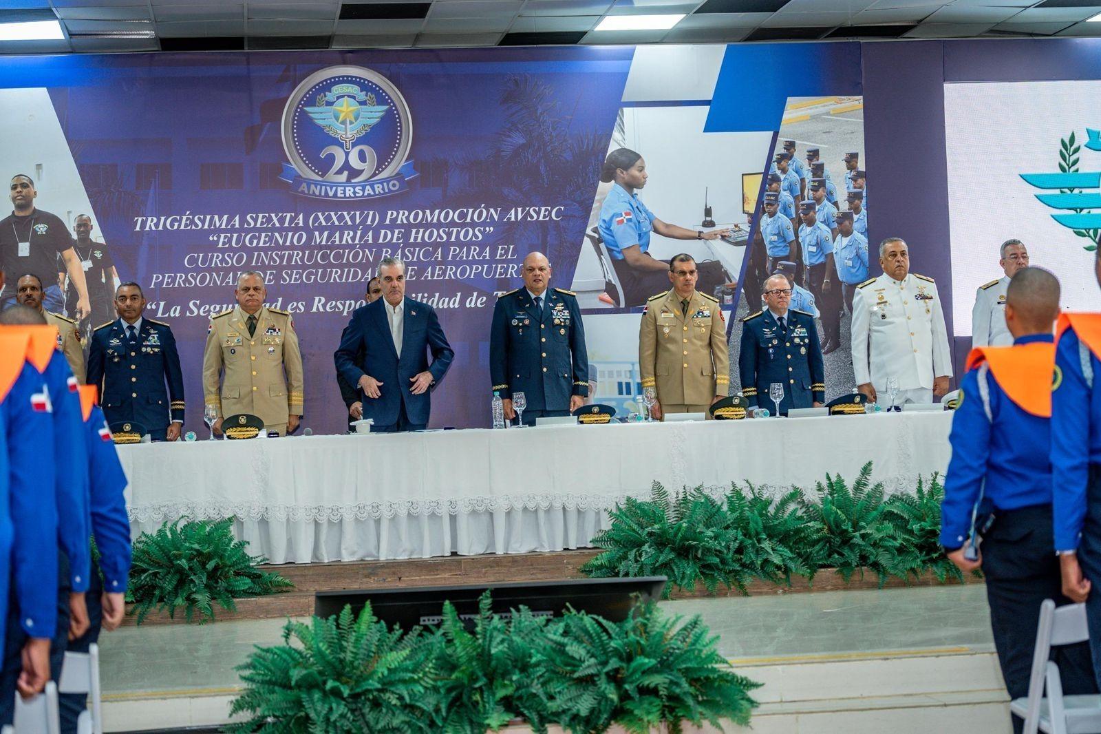 El presidente Luis Abinader encabezó este viernes el acto de graduación múltiple del Cuerpo Especializado en Seguridad Aeroportuaria y de la Aviación Civil (CESAC), correspondiente a la Trigésima Sexta Promoción del Curso de Instrucción Básica para el Personal de Seguridad de Aeropuertos “Eugenio María de Hostos”, en el marco de la conmemoración del 29.º aniversario de esa institución.