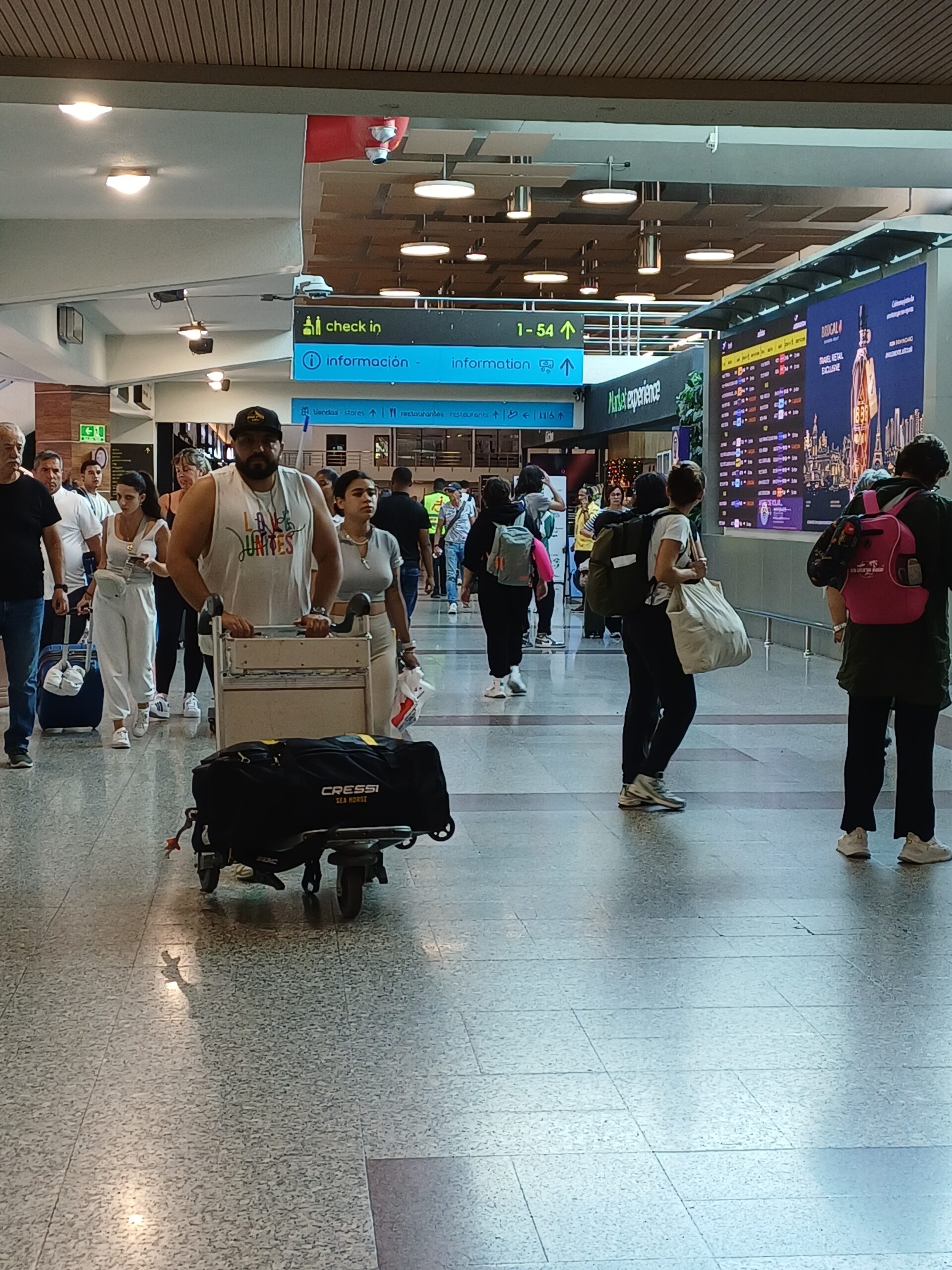 En la terminal aérea de Las Américas se observó un flujo moderado de viajeros en los mostradores de las compañías afectadas, gestionando cambios de fecha y solicitando información sobre nuevas salidas.