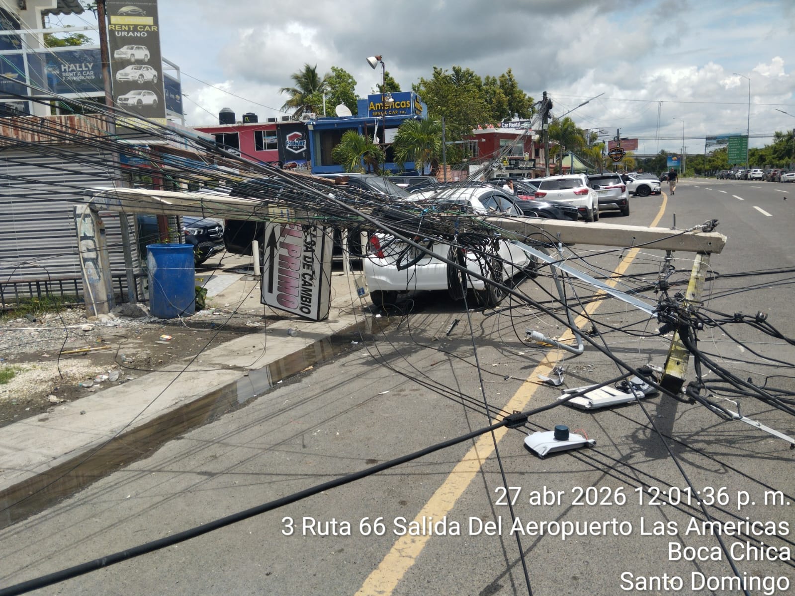 La caída sorpresiva de un poste del tendido eléctrico en la Ruta 66, vía que conecta con la salida del Aeropuerto Internacional de Las Américas, José Francisco Peña Gómez, desató este lunes un prolongado caos vehicular que afectó tanto a conductores como a pasajeros que se desplazaban hacia y desde la terminal aeroportuaria.
